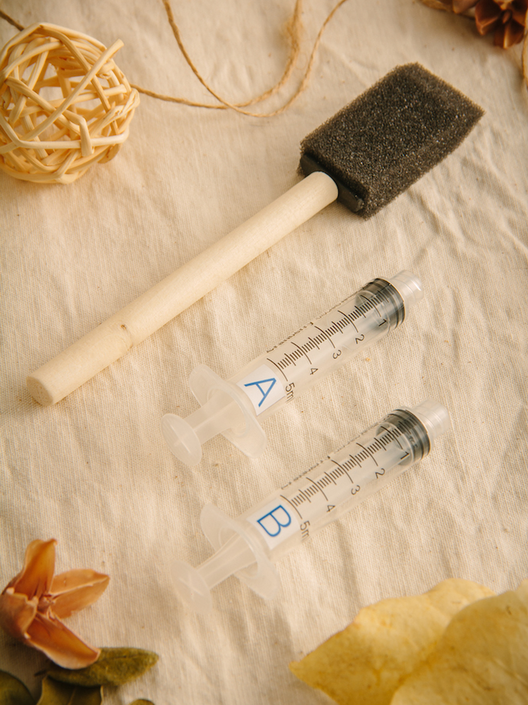 1. Realizar la mezcla. Con cada jeringa extrae la cantidad que desees utilizar y mézclalas en un recipiente, la proporción es 1:1 (misma cantidad de solución A y B). Para una hoja tamaño carta puedes utilizar 2 ml de cada solución.